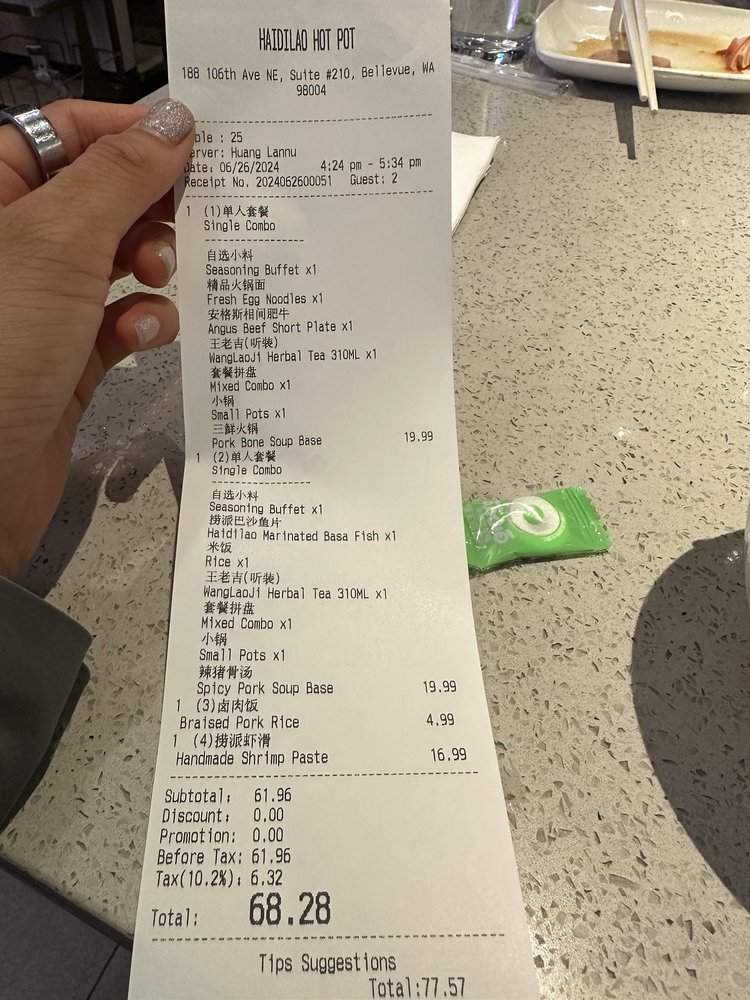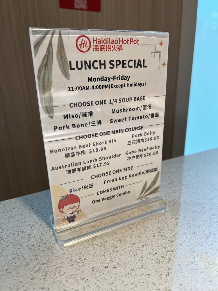 Introducing the menu at Haidilao Hot Pot Bellevue, a top-notch hot pot spot in Bellevue, WA. This restaurant offers a wide range of amenities such as takeout, delivery, vegan options, wheelchair accessibility, and more. Customers rave about the impeccable service and high-quality food, with standout dishes like angus beef, lamb, and Tom Yum soup base. The elegant decor and attentive staff create a warm and inviting atmosphere, making dining here a truly extraordinary experience. The menu boasts fresh, high-quality ingredients and a delightful array of flavorful dishes. With a well-stocked sauce bar and attentive waitstaff, Haidilao Hot Pot Bellevue is a must-visit for any hotpot lover looking for a top-notch dining experience.